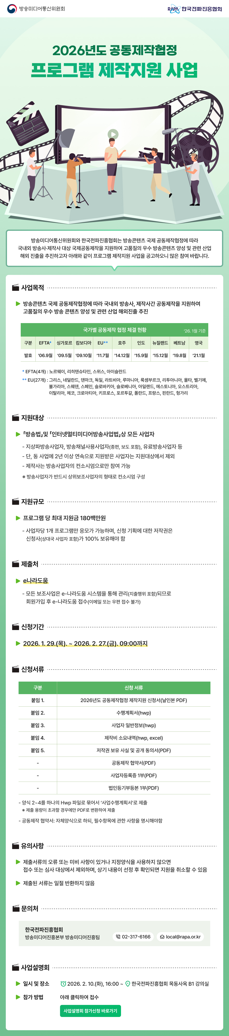 2026년도 공동제작협정 프로그램 제작지원사업 한국전파진흥협회 2026-01-30 한국방송협회 0 524 01.30 14:49 2026.01.30 14:49 2026년도 공동제작협정 프로그램 제작지원 수행지침.pdf (422.4K) 2026.01.30 14:49 공동제작협정 프로그램 제작지원_붙임 서류신청서 등.zip (225.8K)