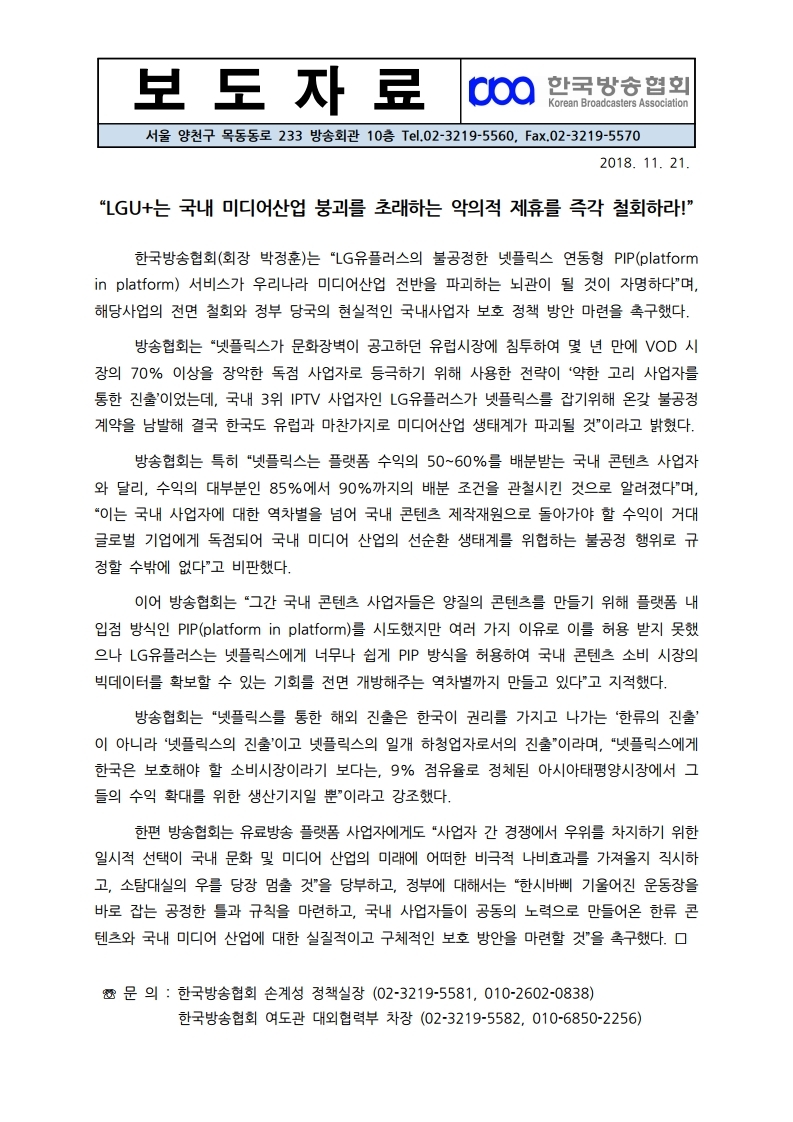 [한국방송협회 보도자료] LGU+는 국내 미디어산업 붕괴를 초래하는 악의적 제휴를 즉각 철회하라! 2018-11-21 한국방송협회 0 1210 2018.11.21 16:03 2023.10.13 11:13 [한국방송협회 성명서] LGU+는 국내 미디어산업 붕괴를 초래하는 악의적 제휴를 즉각 철회하라.pdf (219.1K) 2023.10.13 11:13 [한국방송협회 보도자료] LGU+는 국내 미디어산업 붕괴를 초래하는 악의적 제휴를 즉각 철회하라!.pdf (201.5K) 2023.10.13 11:13 [한국방송협회 보도자료] LGU+는 국내 미디어산업 붕괴를 초래하는 악의적 제휴를 즉각 철회하라!.hwp (506.0K) 2023.10.13 11:13 [한국방송협회 성명서] LGU+는 국내 미디어산업 붕괴를 초래하는 악의적 제휴를 즉각 철회하라.hwp (19.0K)