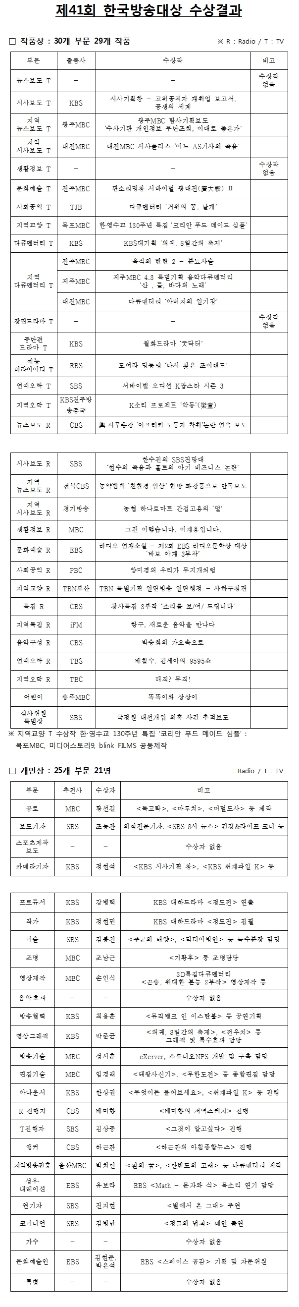 * 첨 부 : 제41회 한국방송대상 수상작/수상자 리스트 1부