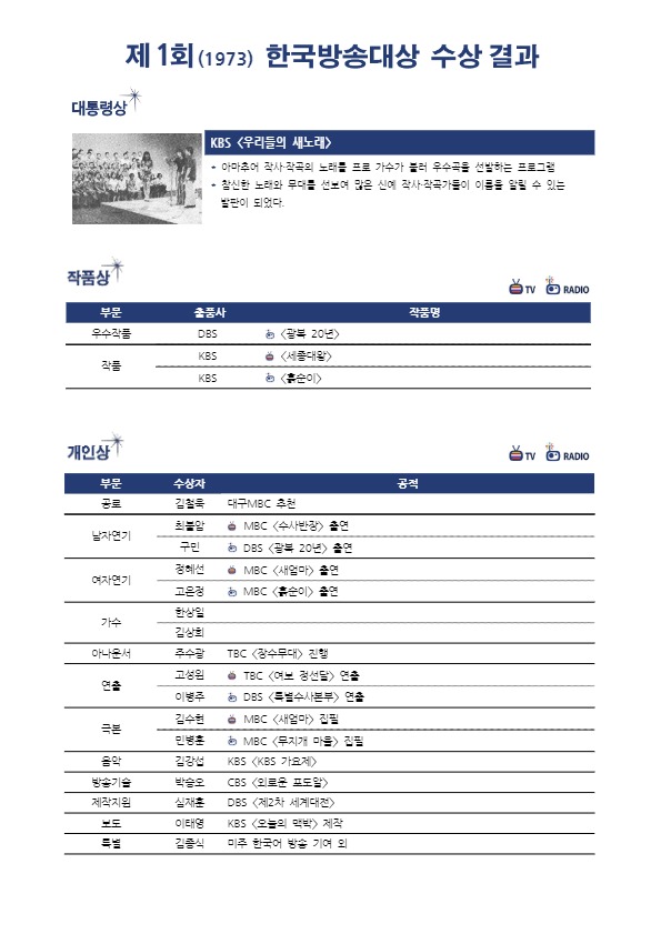 제1회 한국방송대상 수상결과(1973년) 최고관리자 0 301 2023.05.23 09:53 첨부파일 1st-winners-list.pdf download 1st-winn… download 2023.05.23 09:53